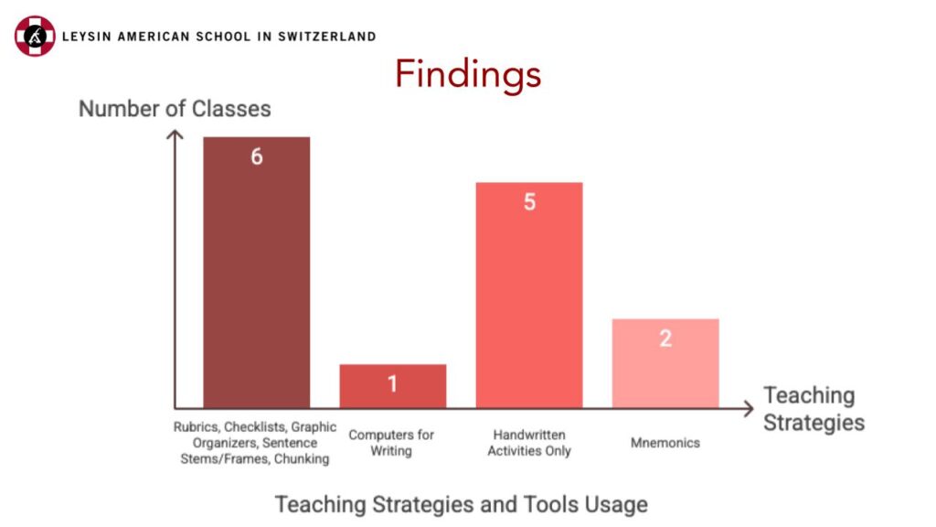 Also inspired by the MLRC Research Symposium, LAS English Language Acquisition (ELA) teacher Mari McCarville launched an action research project to investigate effective ways to support neurodiverse multilingual learners with academic writing. At the beginning of the school year, she had noticed that many of her students in the ELA program also had an Individualized Learning Plan and were receiving learning support services. These neurodiverse multilingual learners were struggling with their academic writing tasks in Mari’s class, so she began her research by asking: According to existing research, what strategies best support academic writing for neurodiverse multilingual learners? She reviewed ten studies about teaching academic writing to neurodiverse and/or multilingual learners, and she compiled the findings into a list of 40 instructional and learning strategies. Then she asked: What writing strategies do LAS teachers already use with 7-12th grade neurodiverse multilingual learners? To answer this question, Mari created an observation protocol with the 40 strategies and observed six classes while students were engaged in writing tasks.